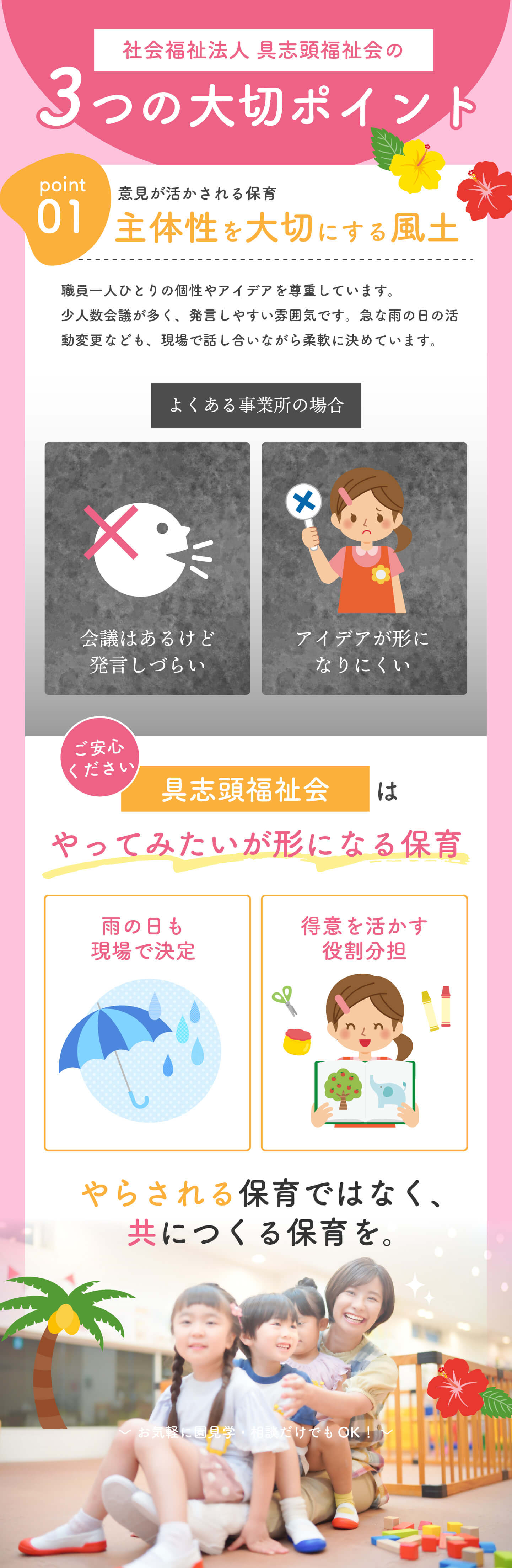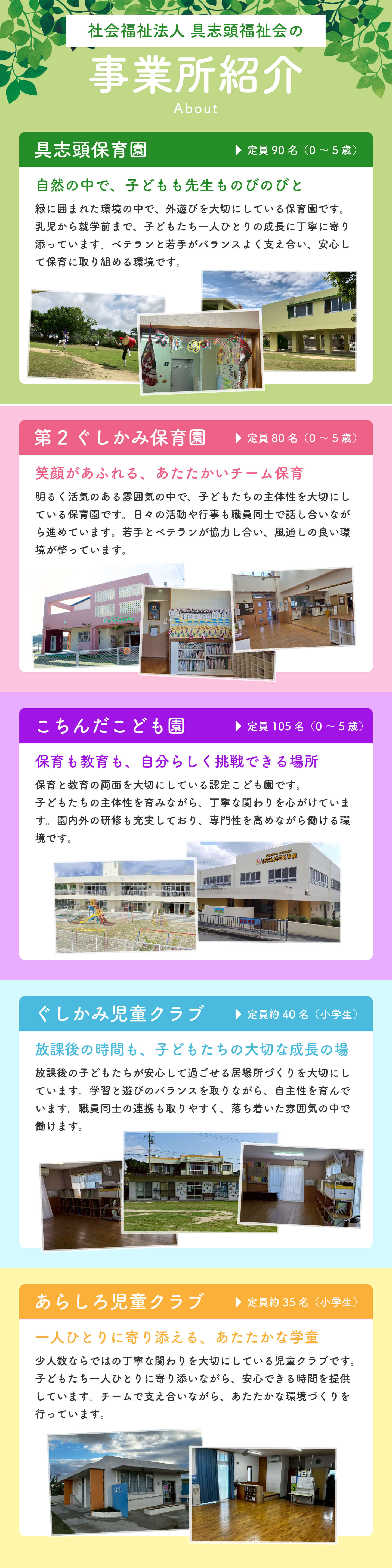 | 事業所名 | ・具志頭保育園 ・第2ぐしかみ保育園 ・こちんだこども園 ・ぐしかみ児童クラブ ・あらしろ児童クラブ |